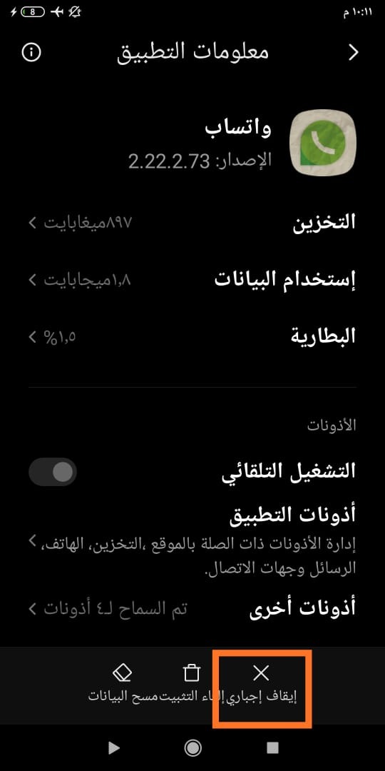 • للتمكن من خداع التطبيق وحذف رساله واتس لدى الجميع بعد تجازر المدة المسموحة، يجب عليك إيقاف الواتس من العمل عبر النقر على زر “إيقاف إجباري” من خلفية الهاتف، كما هو موضح في الصورة.