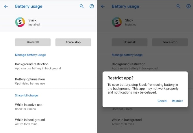 أما بالنسبة على نظام تشغيل الأندرويد، يمكنك بالفعل تحديد مقدار البطارية التي يستخدمها كل تطبيق فردي أثناء التشغيل في الخلفية، كبديل أفضل لإغلاقها، عن طريق الانتقال إلى الإعدادات> التطبيقات والإشعارات تحت صفحة البرامج هذه، انتقل إلى خيارات متقدمة> البطارية> تقييد الخلفية.