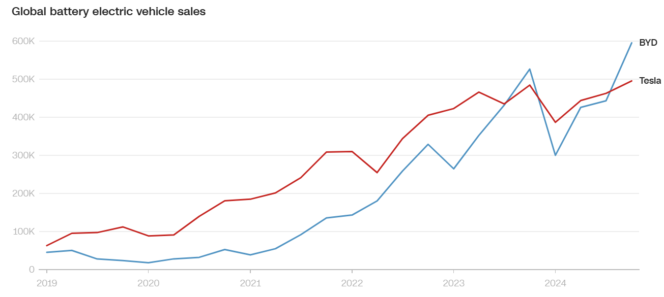 BYD الصينية تتفوق على تسلا في مبيعات السيارات الكهربائية لعام 2024
