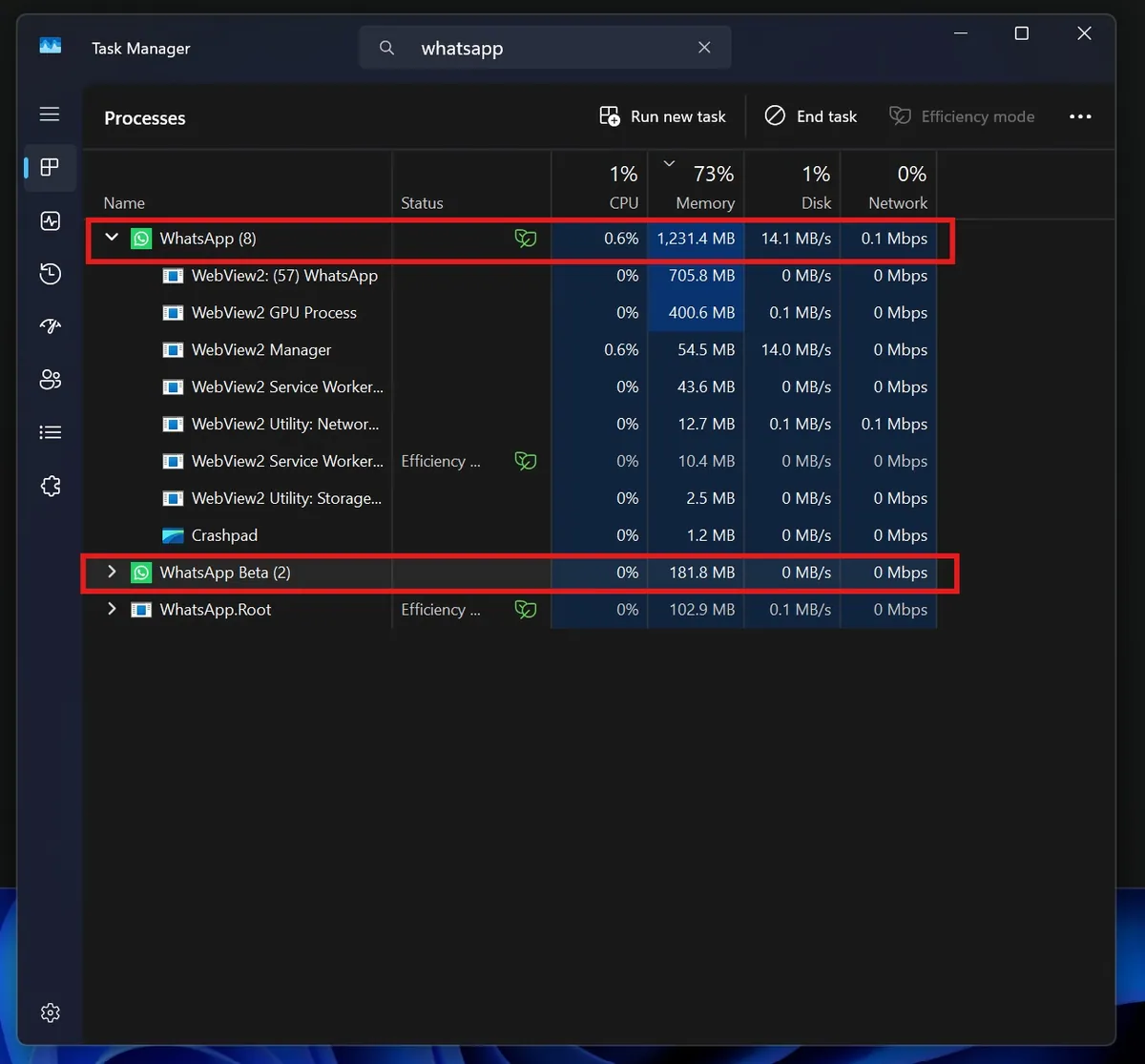 - التطبيق الجديد (WebView2): ارتفع الاستهلاك إلى 2 جيجابايت (2000 ميجابايت) أثناء تحميل المحادثات، واستقر عند 1.2 جيجابايت في المتوسط أثناء الخمول في الخلفية.