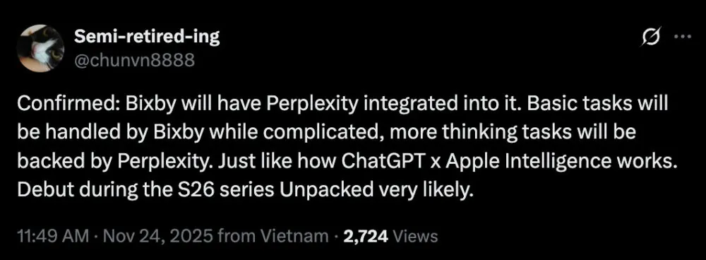كشفت تقارير تقنية موثوقة أن شركة سامسونج تعمل حاليًا على دمج محرك البحث الذكي Perplexity AI داخل مساعدها الصوتي، بيكسبي – Bixby – في خطوة استراتيجية تهدف إلى إعادة إحياء مساعدها الشخصي والمنافسة بقوة في سوق الذكاء الاصطناعي.