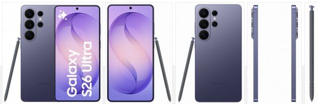 وتُظهر الصور هاتف Galaxy S26 Ultra بخيارات الألوان: الأسود، والبنفسجي الكوبالت، والأزرق السماوي، والأبيض.