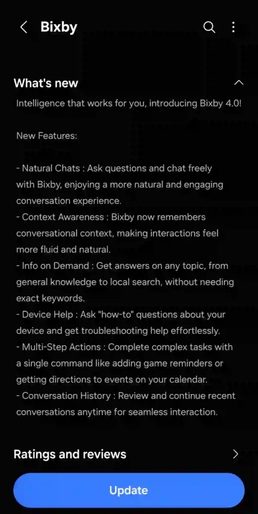 تحديث Bixby 4.0 متاح الآن تدريجياً عبر متجر Galaxy Store، إذا لم يظهر لك التحديث بعد، فمن المتوقع وصوله إلى جهازك خلال الأسابيع القادمة مع توسع سامسونج في دعم المناطق الجغرافية المختلفة، ليصبح بيكسبي المنافس الأقوى في ساحة المساعدات الذكية لعام 2026.