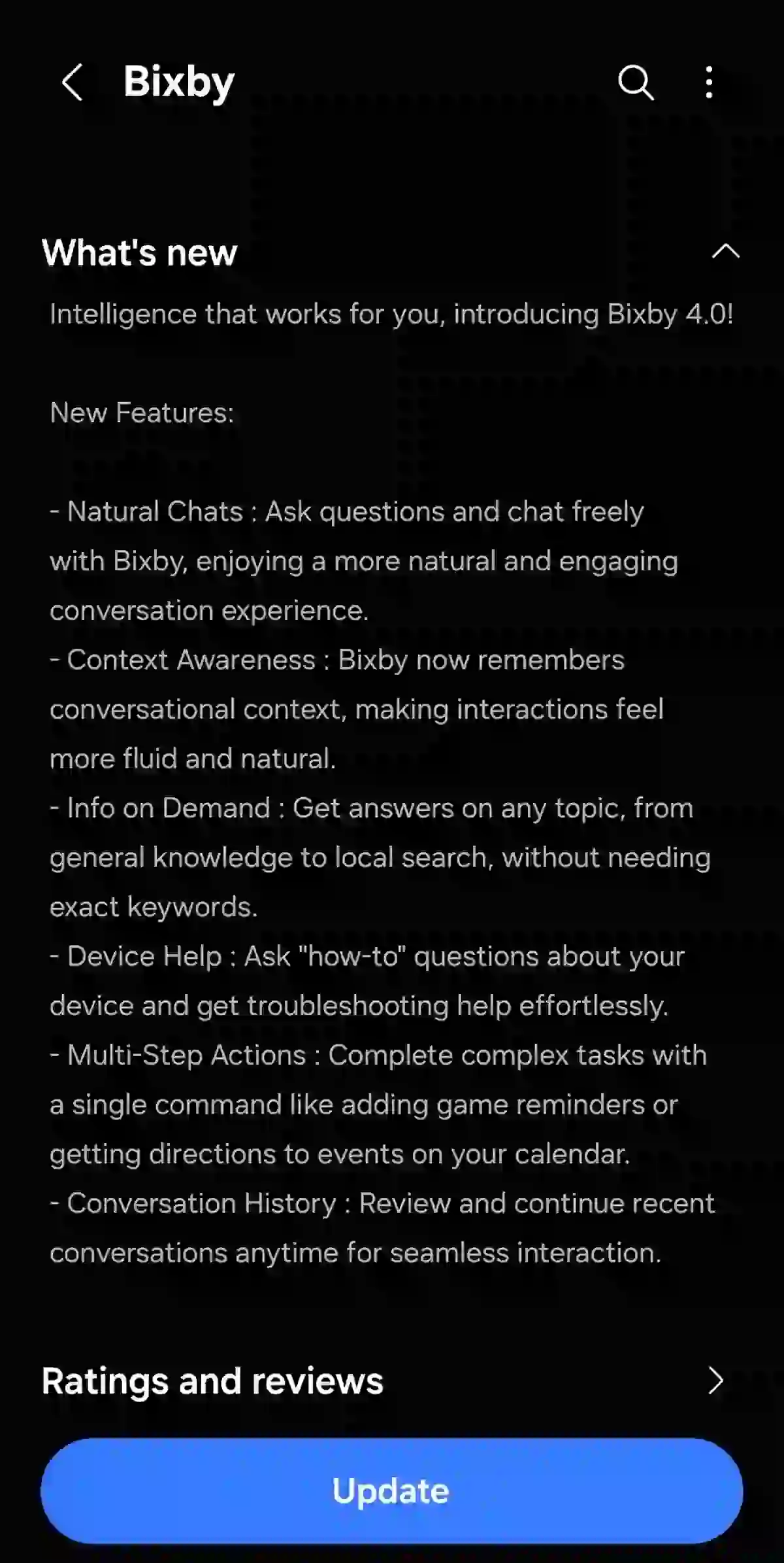أبرز ما يميز إصدار Bixby 4.0 هو محرك معالجة اللغة الطبيعية المطور، والذي قدم ثلاث ميزات ثورية، على رأسها الدردشات الطبيعية، حيث يتيح للمستخدم التحدث مع المساعد بحرية تامة دون الحاجة لصيغ أوامر جامدة.